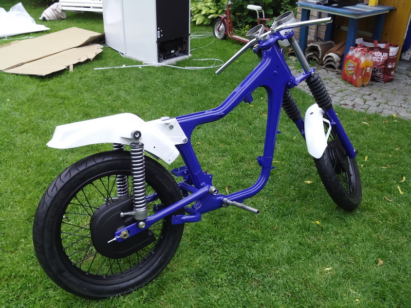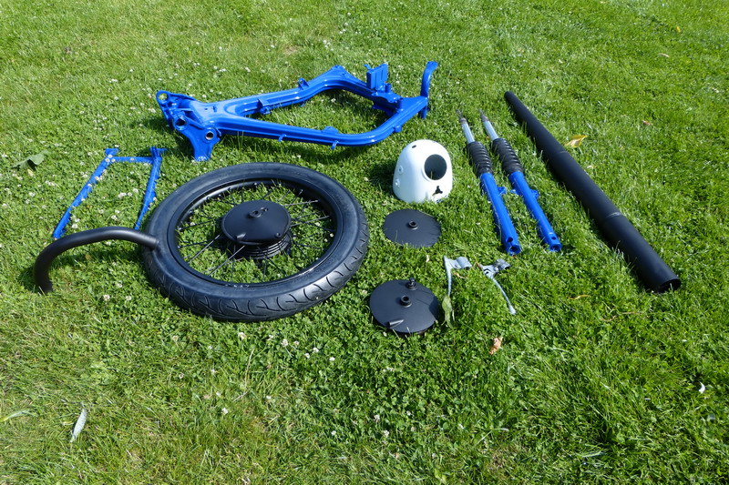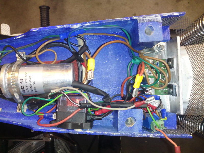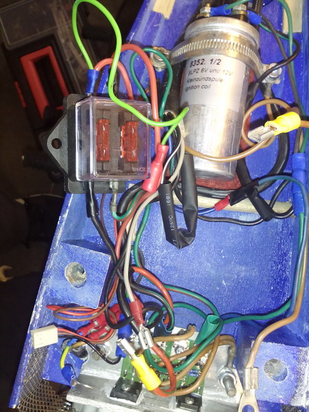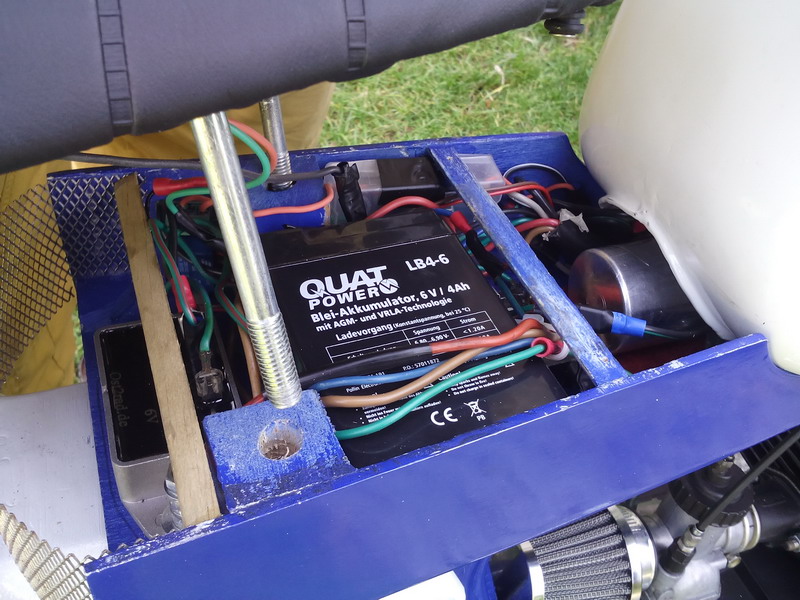 | 2. September 2016 | Die gesamte 6V Elektrik inclusive Akku, Zündspule, Regler, Stepup Module und Relais wird in den Kasten unter dem Sitz eingebaut. Eine kleine Herausforderung! |